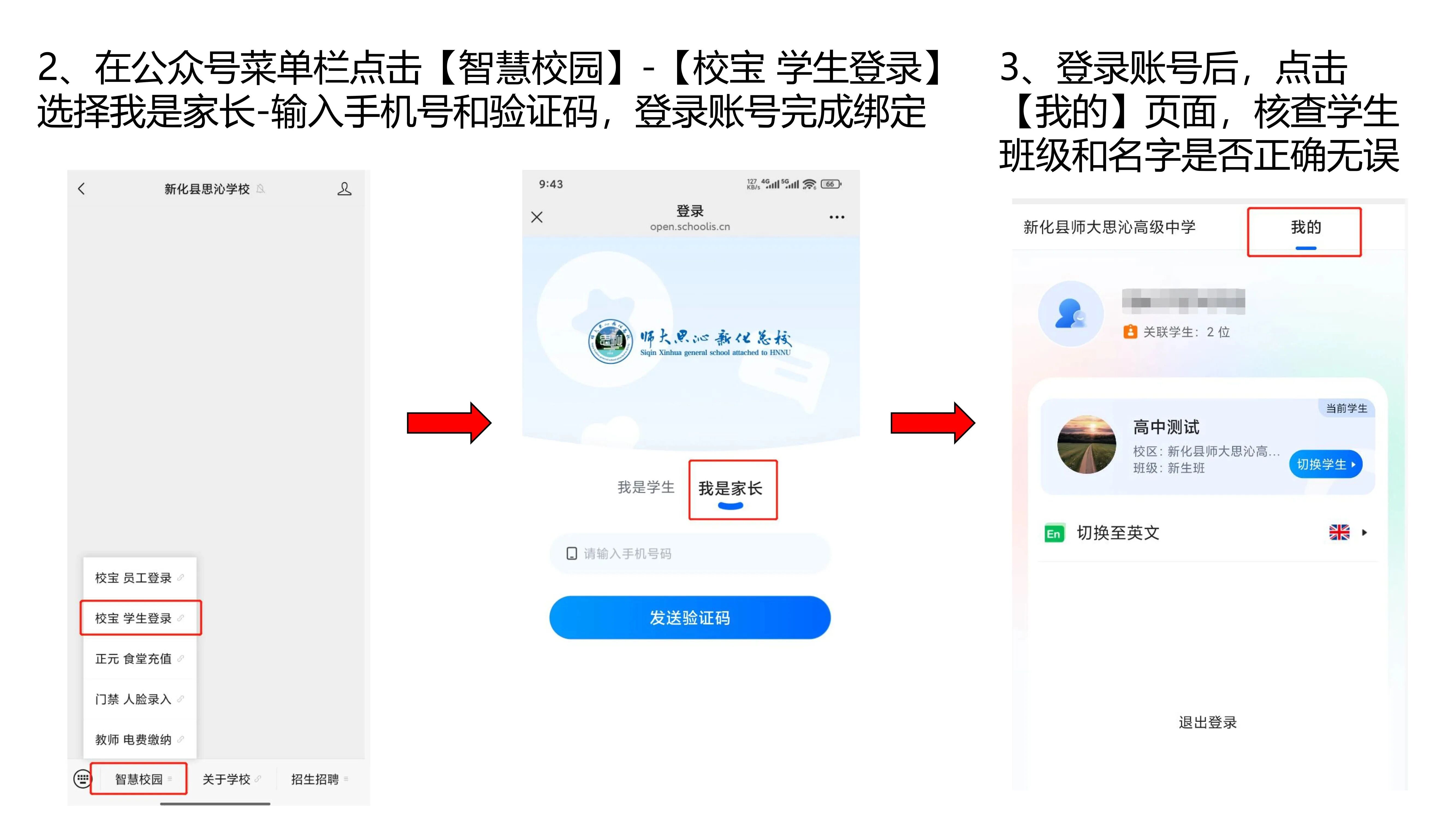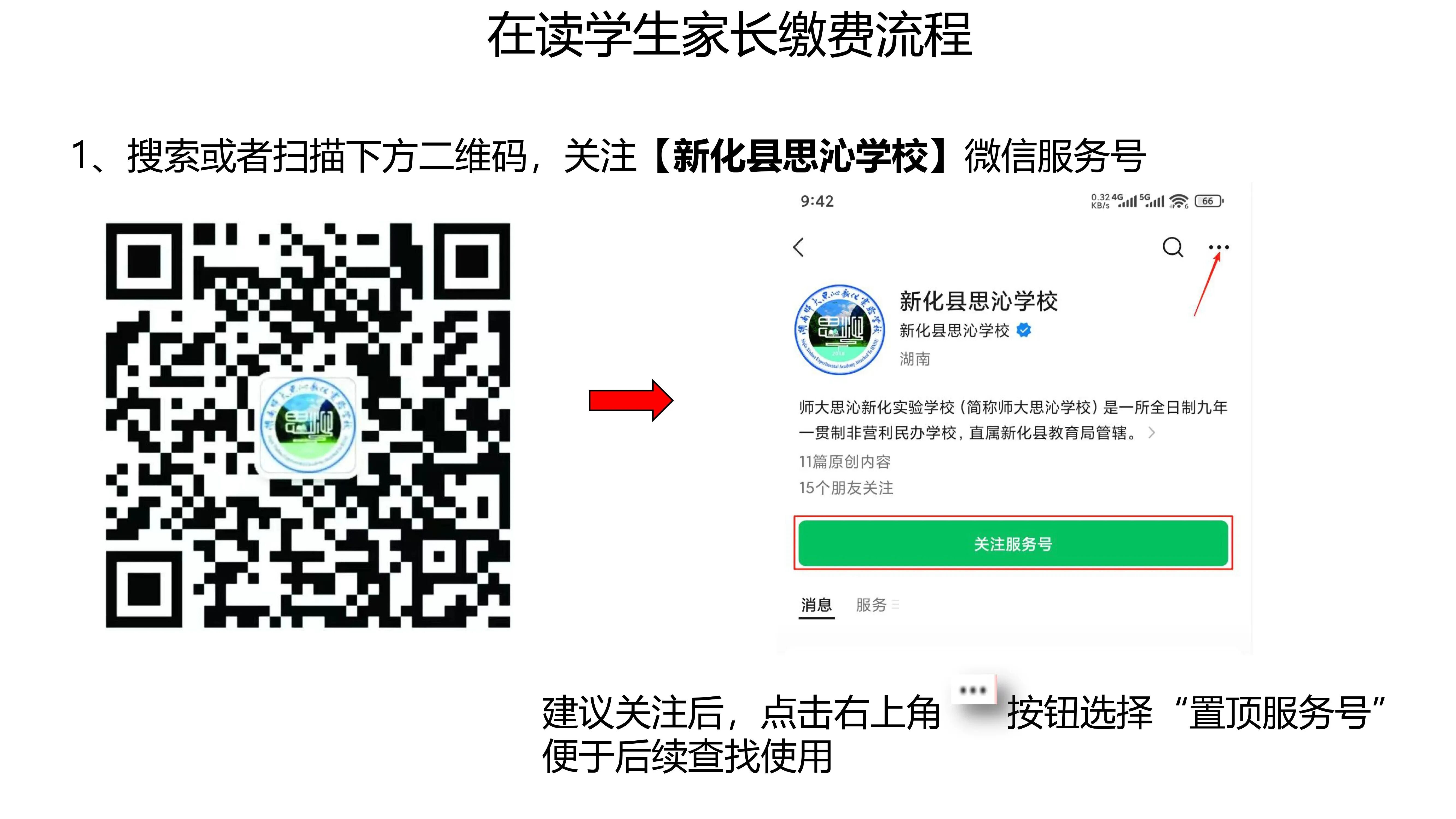 智慧校园缴费流程:家长微信关注“新化县思沁学校”公众号(上面有),然后点击“智慧校园“,选择校宝学生登录,选择我是家长,输入家长手机号和验证码,登录账号完成绑定(如提示账号错误无法登录请及时联系班主任寻求帮助),登录之后点击“我的”,检查登录学生信息是否准确,确认无误后点击“缴费”,查看缴费通知,按步骤提交订单即可。