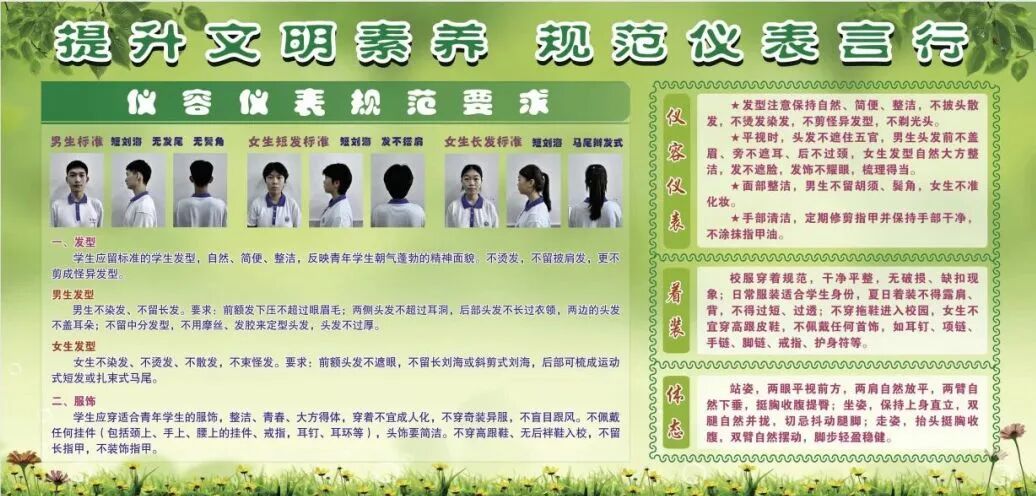说明:仪容仪表不合格的,学生发展处会当即教育整改,拒不配合的同学,学校有权拒绝接收。