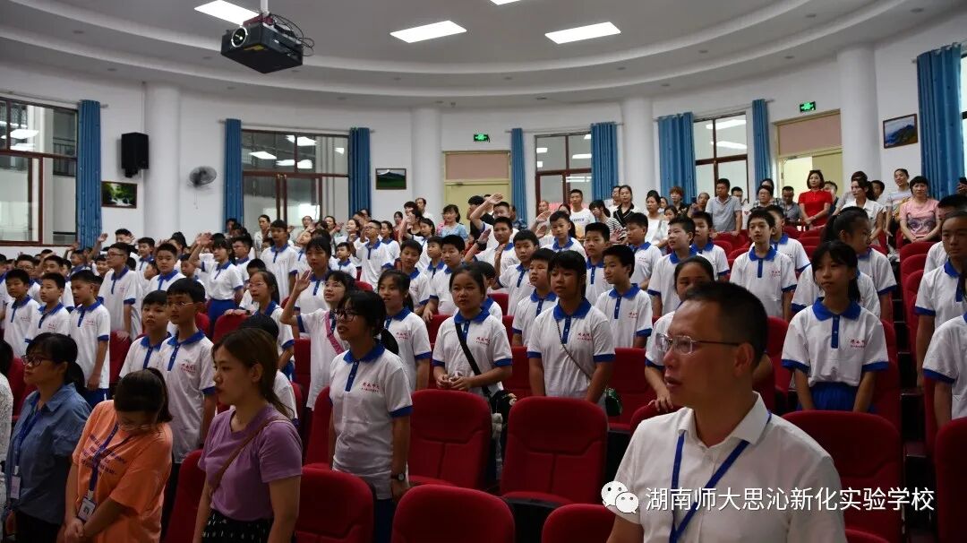上午10:00,换上统一校服穿戴整齐,同学们进入了环形报告厅,在湖南师大思沁新化实验学校校歌声中,拉开了隆重的夏令营开营仪式大幕。在校的全体校领导参加了仪式,陈克勤校长在会上做了热情洋溢的致辞,他指出,名校访学是我校拔尖创新人才培养的第一步,活动包括:专题讲座—出征仪式—参观一中—访问长沙思沁并于同龄人深度交流—走进师大附中参观刻满学科奥赛世界金牌得主及其教练名字的“攀登碑”—聆听金牌教练讲学—与录取北大、清华学长面对面—信步附中优雅校园参观附中校史馆—到橘子洲头瞻仰伟人塑像……精心规划的行程,深度励志之旅。拔尖创新人才的必备品格是:有家国情怀、善于选择、自主自律、大公无私、仁爱精勤,而思沁校园里就很多这样的人!成绩优秀不等于优秀学生。这一趟旅行,就是要让同学们明白这些道理。
