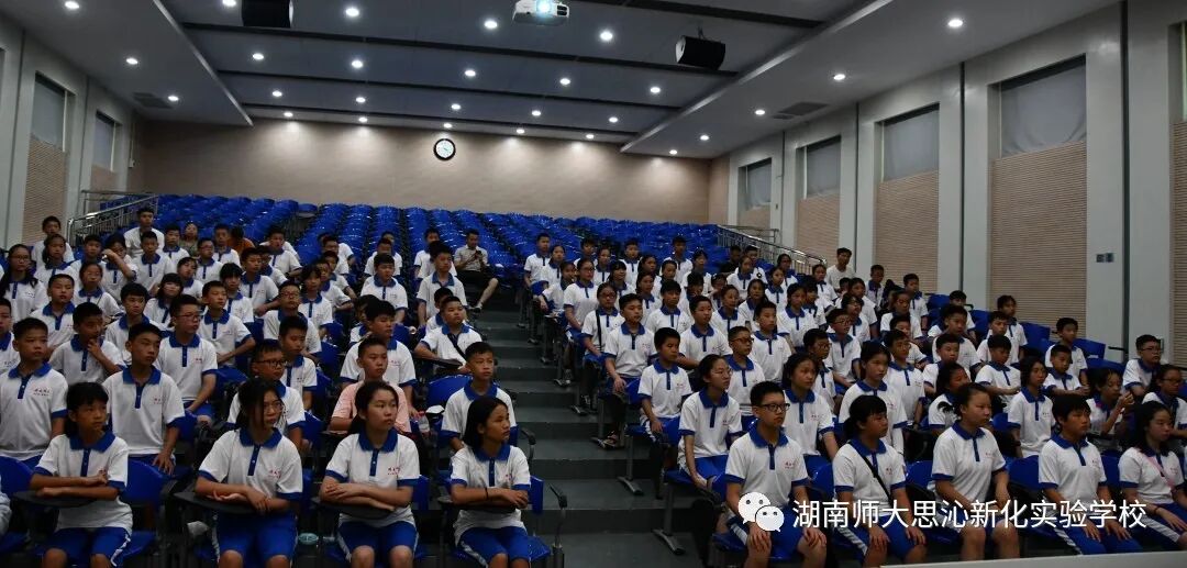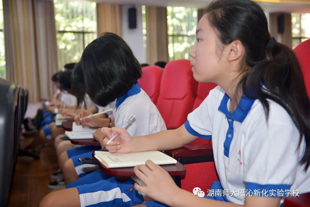 由于天气较热,同学们首先走进阶梯聆听了湖南师大附中金牌教练,高三年级组长李海汾主任关于拔尖创新人才培养的讲座,李主任用他幽默的话语,标准的普通话讲述了湖南师大附中这所百年名校的发展史和辉煌史,现场迎来了一波又一波雷鸣般的掌声,当讲到升学率和校友名人时,同学们已经按耐不住心中的憧憬和崇拜之情,有的同学直接站起来鼓掌。